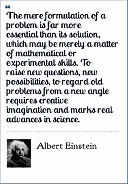 爱因斯坦在1938年与波兰物理科学家英费尔德(Leopold Infeld)合著的《物理学的进化(The Evolution of Physics)》中指出:“提出一个问题往往比解决一个问题更为重要,因为解决一个问题也许是一个数学上或实验上的技巧问题。而提出新的问题、新的可能性,从新的角度看旧问题,却需要创造性的想像力,而且标志着科学的真正进步。”