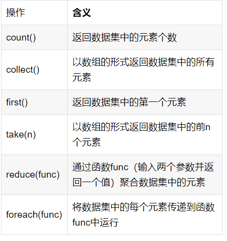 行动操作是真正触发计算的地方。Spark程序执行到行动操作时,才会执行真正的计算,这就是惰性机制,“惰性机制”是指,整个转换过程只是记录了转换的轨迹,并不会发生真正的计算,只有遇到行动操作时,才会触发“从头到尾”的真正的计算,常用的行动操作: