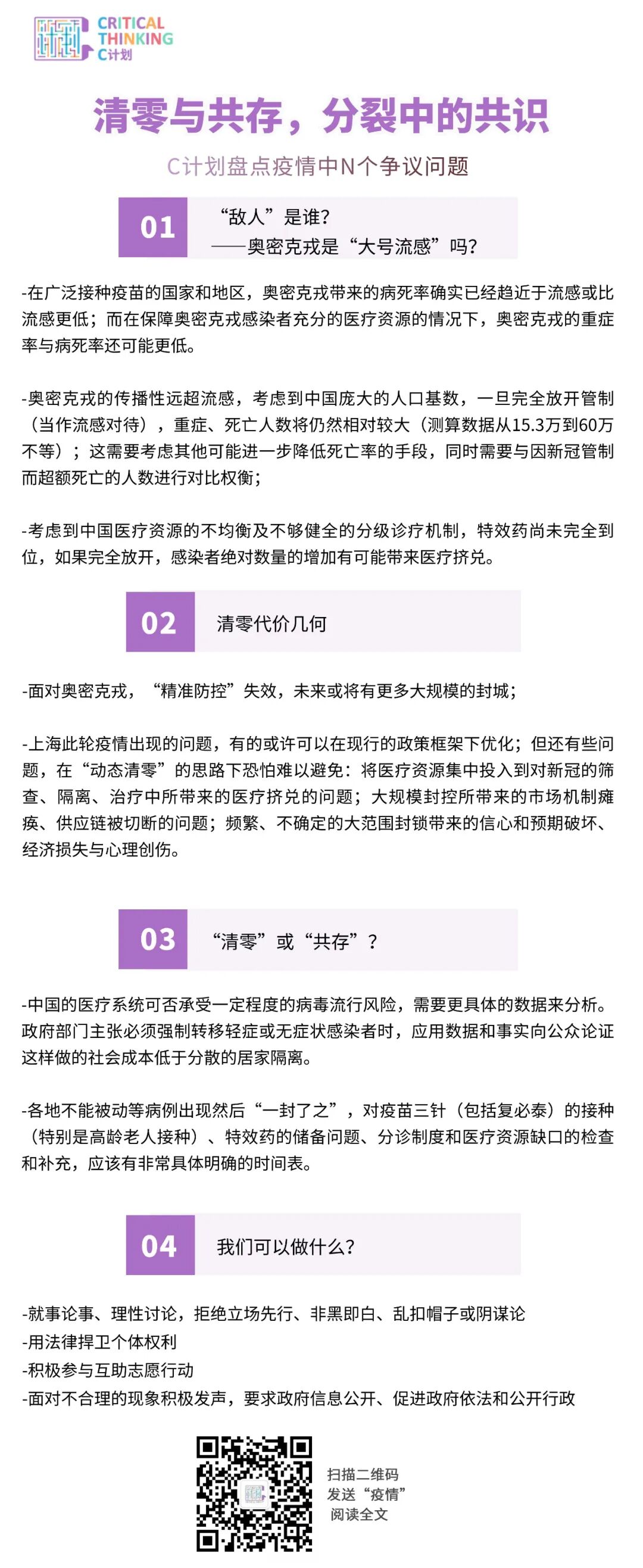 被大量转发的疫区聊天记录、持续不断的求助信息、让人悲愤交加的短视频,不同学者、自媒体的观点针锋相对,新闻、数据难辨真伪。或许在你的朋友圈、微信群中,你已经意识到了观点之间的不同带来的巨大割裂。这种割裂加上疫情为我们的生活、工作、学习带来的实质性影响,更使人感到焦虑、抑郁、崩溃。C计划希望通过这篇文章,能帮助你梳理已知的信息、观点,从而更好地思考。关于奥密克戎,关于“清零”或“共存”,我们的下一步,究竟应该做些什么。