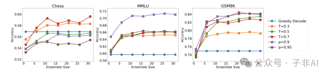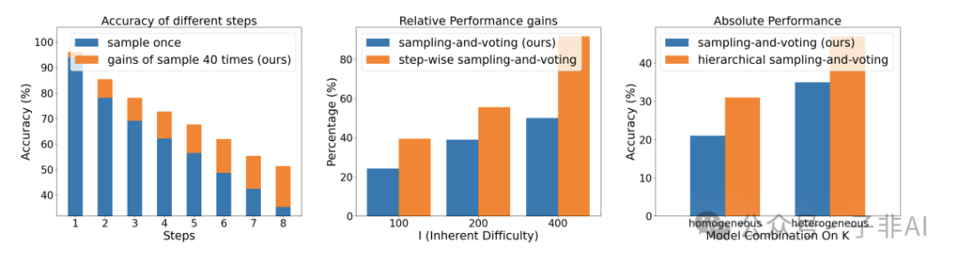 实验结果显示,Sampling-and-Voting 方法的性能提升与任务难度密切相关。在简单任务上,提升效果可能并不明显,但在复杂任务上,性能提升则更为显著。这表明该方法更适合用于解决那些对单个 LLM 具有挑战性的问题。