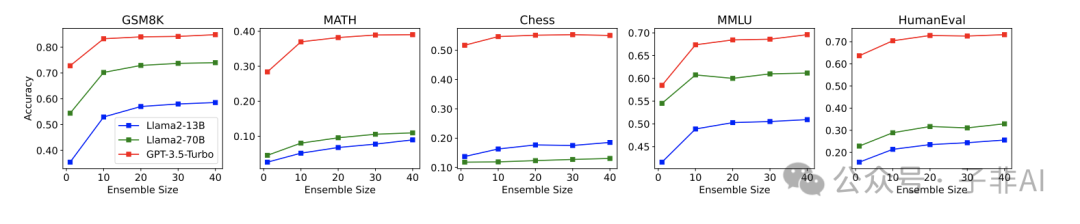 观点二:小型模型也能媲美大型模型: 通常认为,大型 LLM 拥有更好的性能。然而,本文实验表明,通过增加代理数量,小型 LLM 可以达到与大型 LLM 相当甚至更好的性能水平。