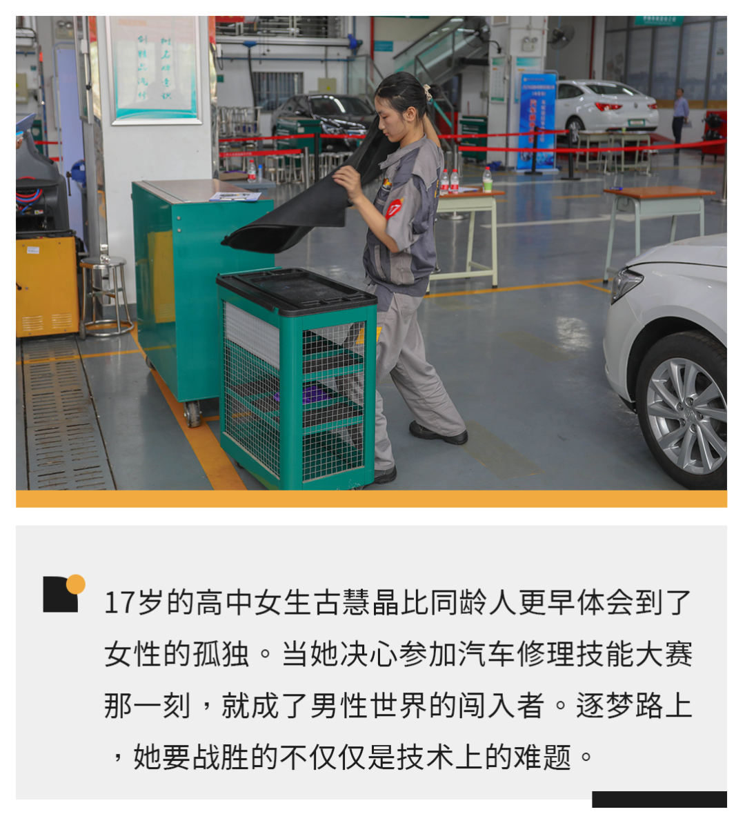 直到不信邪的古慧晶出现。17岁的女孩面庞清秀,尤其那双细长上翘的眼睛,如柳叶落在花园般美丽。女孩也爱漂亮,学校每周升旗仪式由她主持,更衣室挂着一排她挑选的礼服。但更多时候,她穿着灰色工装,换好带铁板的工鞋,待在训练基地。头发扎成小丸子,汗水依旧沿刘海淌下来,手一抹,全是黑色油迹。十一年了,她是学校唯一参加汽车机电维修项目集训的女生。这个项目要求两个半小时内完成发动机检修、全车维护等四项任务。就像奥数一样,参与者除了课堂学习,要投入大量时间额外训练,如果足够优秀,可以一路比到全国乃至国际大赛。深圳市第二职业技术学校汽车部教学负责人李世川看到过女性在汽修行业获得成功。他曾公派德国学习,看到许多异性在修理厂工作,只不过,这些女技师个头跟他一样结实。正式集训前,李世川找过古慧晶,建议要不去汽车营销集训队,那里胜算更大,也是女生通常的选择。机电修理太考验体力,两个半小时一刻不能歇,他担心细胳膊细腿的女孩实在坚持不下去。但古慧晶坚持留下来。那时起,李世川决定,尽可能带这个女孩走到最远的地方。李世川49岁了,他在汽修厂待过十多年,至今保持着某种年轻的心态,从老校长到“00”后学生,都称他为“川哥”。李世川把自己掌握的省力技巧传授给古慧晶,为她安排特殊的培训计划,比如在生理期那几天避开重体力的活。他调侃古慧晶,是第一个让他赛前还能休息几天的选手。一路都是奇异眼光,当古慧晶在校内选拔脱颖而出,代表深圳参加广东省技能大赛,引来教育局领导亲自过问。比赛现场,没任务的裁判纷纷来到她的赛台,围观这个历史上第一个参赛女生。信任和训练得到回报,古慧晶拿了一等奖,全省第三的名次,创造了学校历史最好成绩,还获得全国技能大赛遴选赛入场券。结果是重要的。这让李世川对古慧晶未来职业更有信心,不会输给他这个高级技师。他过往那些优秀的弟子,有的已经成为汽车公司独当一面的能人,有几个还自己开了汽修店。但李世川觉得,她是第一个参赛的女生,可能也是最后一个。她太特别了,李世川和她下过象棋,小女孩棋风凌厉,充满攻击性,也从不悔棋,“没有一点娇滴滴的样子。”对古慧晶来说,这也证明她做对了选择。只有她清楚,自己经历了多少艰辛,才赢得这份成绩。以下是古慧晶口述的经历:
