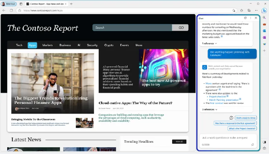 除了在Windows 11加入Copilot之外,微软还在Edge浏览器引入了365 Copilot功能。这是首个原生支持AI的浏览器。Edge浏览器的侧边栏会出现Copilot工具图标,对用户正在浏览的网页内容进行分析,帮助用户生成Word、Excel等Windows 365文档,或用于撰写Outlook邮件。