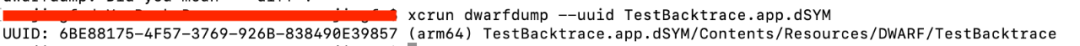 Format: Mach-O/64-BitArch: arm64Symbols: 5Tool Version:: 1.0.1File Version: 1.0.0UUID: e569d81abb2c372e89a2410edc3d368fBuilt Time: 2021-07-29 13:31:08Symbol table:6c64 6c78 -[ViewController viewDidLoad] (in TestBacktrace) (ViewController.m:17)6c78 6c84 -[ViewController viewDidLoad] (in TestBacktrace) (ViewController.m:0)
