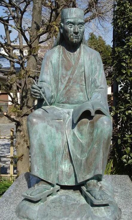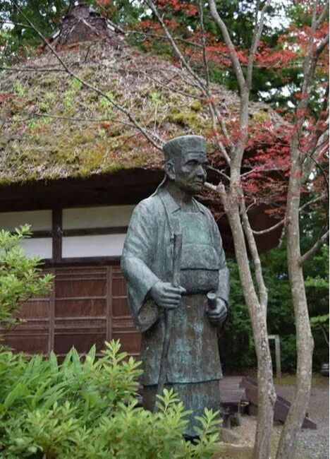 小林一茶(1762-1827),日本江户时代著名的俳人。本名弥太郎,曾号二六庵菊明,后改号为俳谐寺一茶。主要作品有《病日记》(1802)、《我春集》(1812)、《七番日记》(1818)、《我的春天》(1819)等。关于一茶,中国人最熟悉的应当是“瘦蛤蟆,别输掉,这里有一茶!”如果问一茶的形象,大概好多人都会由此想象一个瘦瘦的一茶,看着雄蛤蟆打架,给瘦瘦的一方鼓劲儿。其实,一茶不是瘦瘦的,而是有如山东土生土长的壮实的庄稼汉。日本现存的一茶像不少,著名的就有寺濑默山的“一茶木像”(一茶纪念馆)、“一茶干漆像”(汤田中梅翁寺)和安藤芳洋的“一茶木像”(柏原俳谐寺),此外还有炎天寺中的“小林一茶读书铜像”等等。无论哪尊像,一茶都特别朴实壮实,和身子相比,头稍显大,宽宽的脸膛高颧骨,一付能吞忍世事的宽厚;而紧紧抿成一线的嘴唇,又分明示他的智慧和倔强。