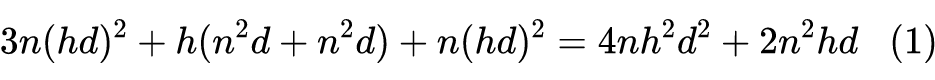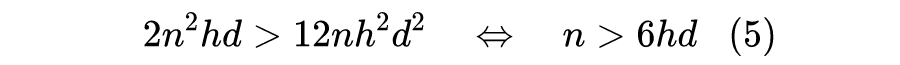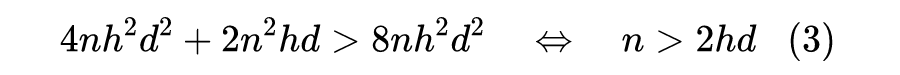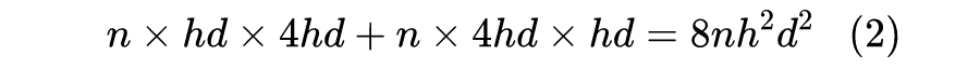 毋庸置疑,SA 的复杂度是 ,而FFN的复杂度则是 ,如果你直接凭此就想当然地说 SA 计算量比 FFN 大,那就错了! 我们知道加法比乘法快很多,所以在估计计算量的时候我们主要计算要做多少次乘法,神经网络里边,主要的运算是矩阵相乘,不难估计按照定义一个 的矩阵乘以一个 的矩阵要做 abc 次乘法 ,所以 abc 就是两个矩阵相乘的复杂度了,这是我们估算 Transformer 复杂度的依据。 设 n 为序列长度,d 为 head_size(base 版是 64),h 为 head 的数目(base 版是 12),那么 hd 就是我们通常说的“hidden_size”(base 版是 768)。对于 SA 来说,一开始是 的投影变换,即 的矩阵乘以 的矩阵做3次,因此计算量是 ;然后是 h 个 Attention 头的运算,每个头先是 的 与 的 相乘得到 的 Attention 矩阵(softmax 和归一化的计算量暂且忽略),然后 的矩阵与 的 相乘得到 的矩阵,这两步的计算量都是 ,所以总计算量是 ;最后的输出还有一个投影变换,也是 的矩阵乘以 的矩阵,计算量是 。所以,SA 的总计算量是