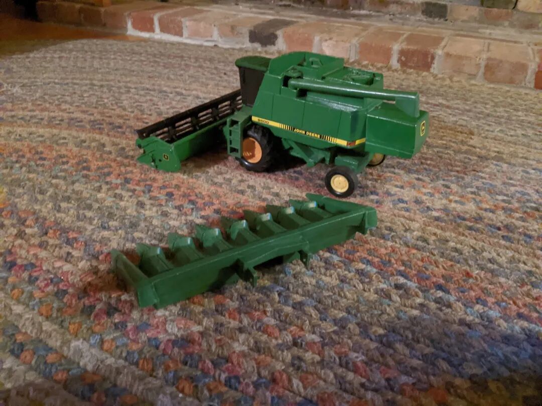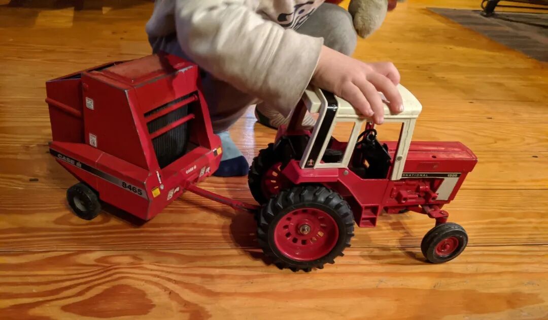 我们拿了一个搂草机玩,里头还装了圆柱形的塑料草垛,铁皮的小车,有点沉,车身上有牌子有型号,从颜色到比例完全仿真,三代熊孩子没玩坏。