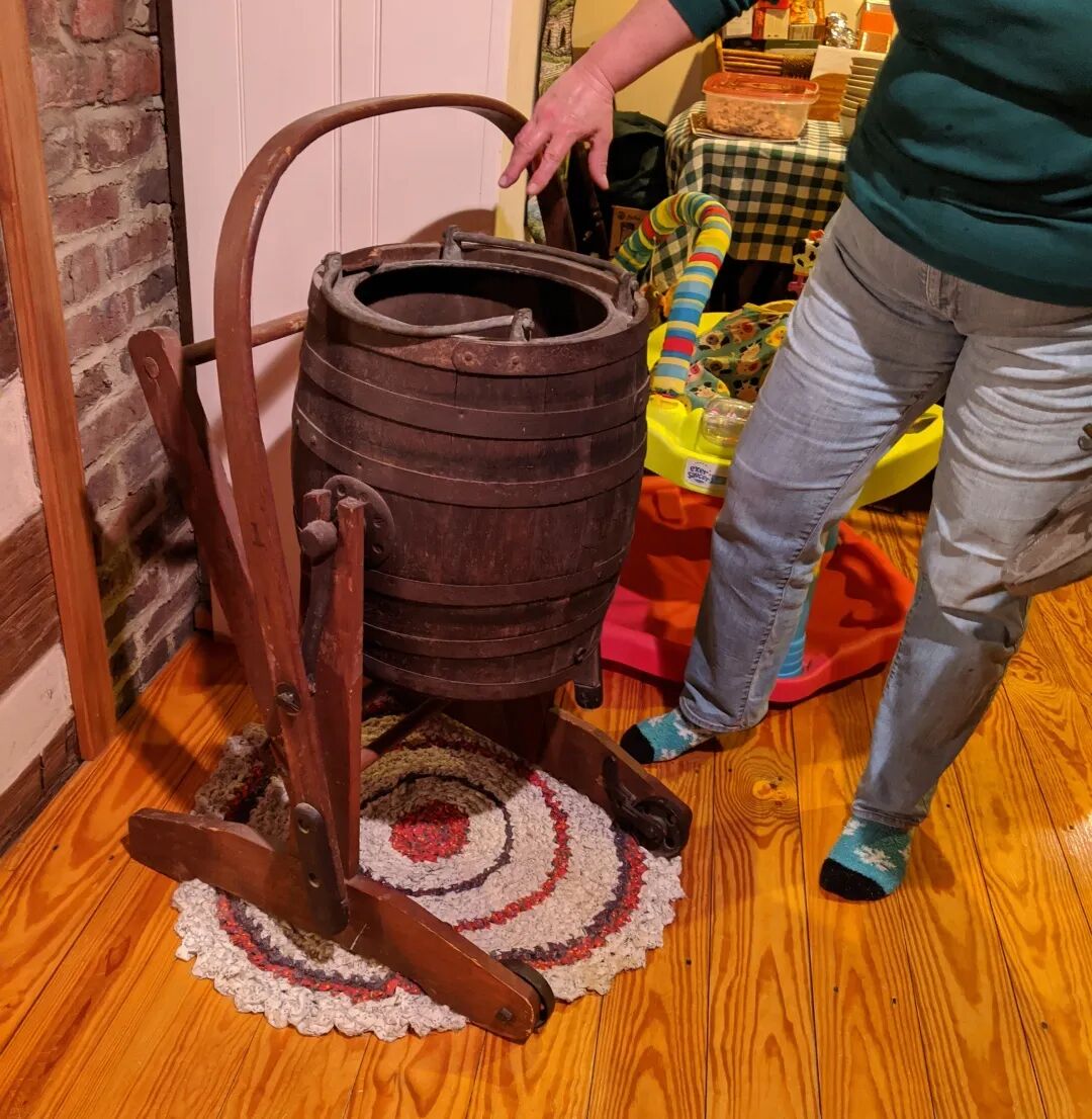 切会儿土豆片看到厨房里一个木桶,莎拉说这是一架洗衣机,一百多年了,理论上也还能用。给我演示了一下,把衣服塞进桶里放水密封,摇一个把手,桶就滚起来了,滚筒式。一个小孩一只手可以洗全家衣服。