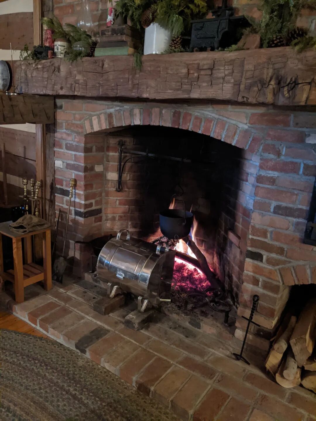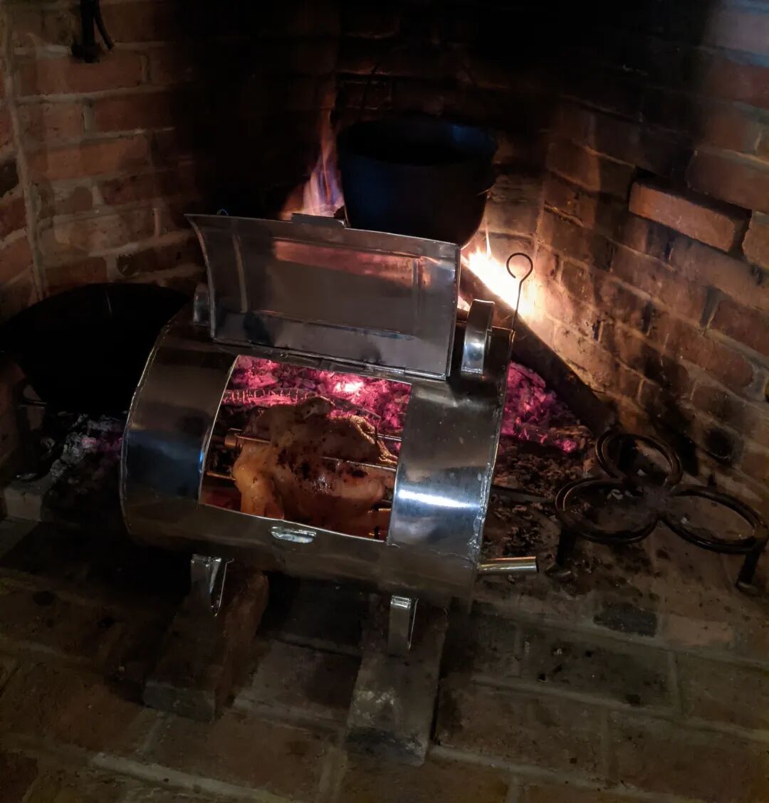 所谓“1830年的晚餐”,主菜是一只烤鸡,在伦福德壁炉前架个锃亮的不锈钢架子,靠火堆的红外辐射和反射把鸡烤熟。其他的菜就是些土豆和豆角,跟“家里人”吃的差不多,只不过是用烧木柴的炉子做的。饭后有个桃子馅饼,用的是他们冻起来的夏天收获的桃子。