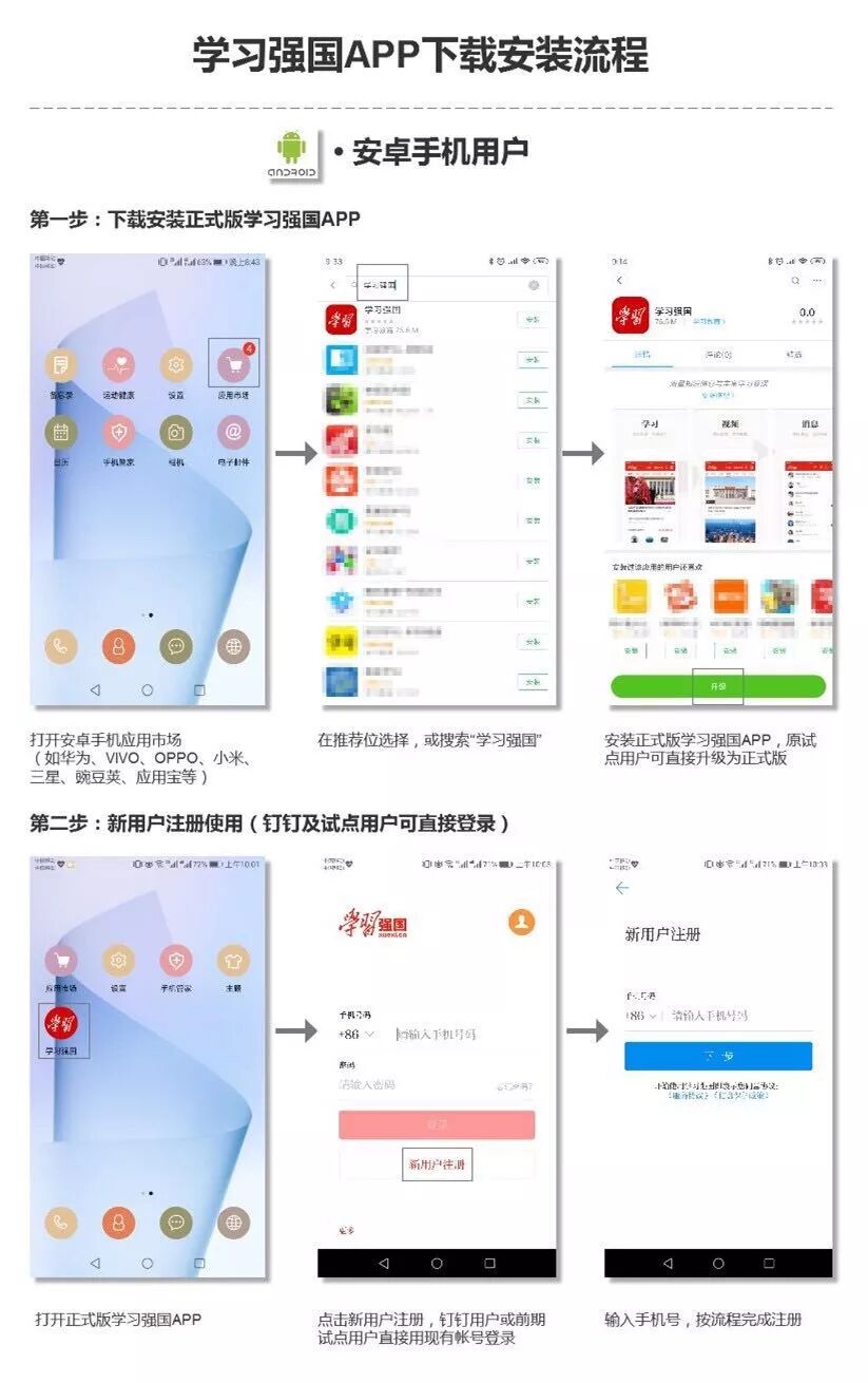 在手机应用市场搜索“学习强国”→下载APP→点击“新用户注册”→输入“手机号码”→阅读完“信息保护政策”后点击右下角“同意”→填写“真实姓名和单位”即可进入“学习强国”→完成注册。