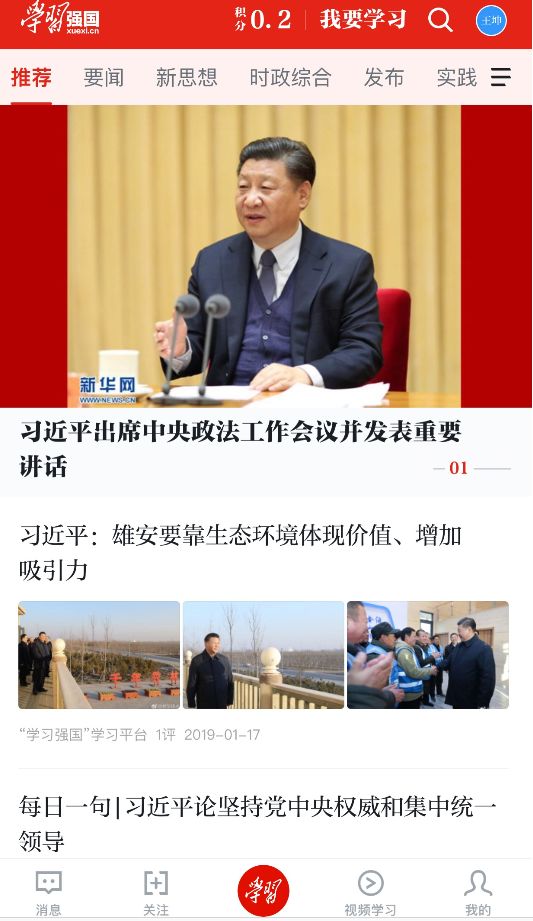 客户端底部,除“学习”“视频学习”外,还有“消息”“关注”“我的”三个按钮。其中,“消息”“关注”按钮下的功能,与办公软件钉钉打通兼容,用户点开“消息”按钮,能直接与钉钉好友聊天。“我的”按钮居最右,它旗下包括学习积分、答题活动、专题考试、我要吐槽、视频会议、建议反馈等子频道。
