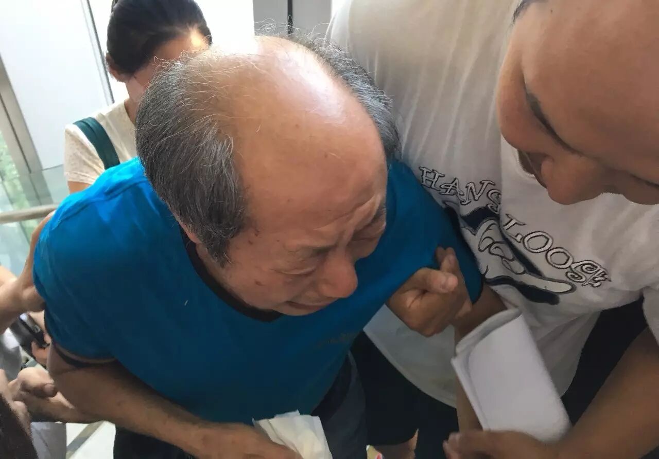 老人彭某失去房子的同时,其子也失踪两个月。8月7日方正公证处的维权现场,老人接到警方电话,误听成叫其去认尸,当场痛哭。图 / 卫诗婕