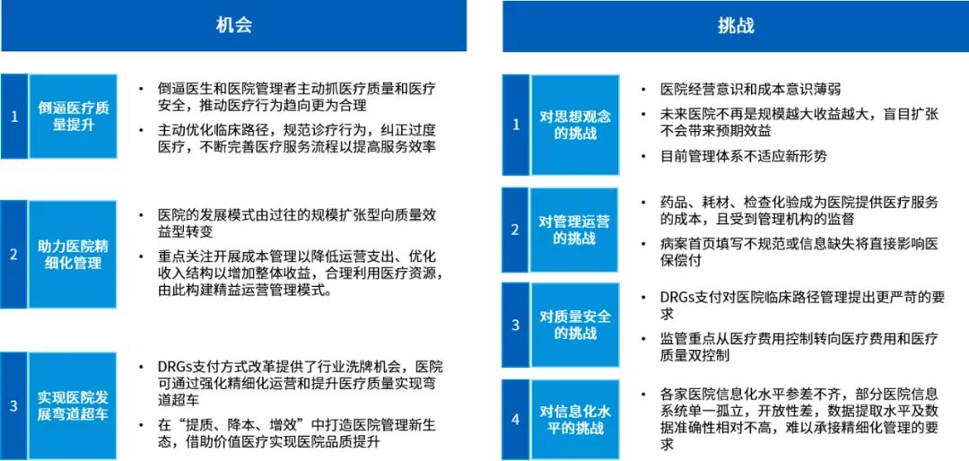 也正因此,DRG支付方式强调性价比,即同一组疾病,收费相同,药品、耗材等资源消耗越多,病人住院时间越长,医院效益就越低,对医院的精细化管理、医生的技术水平提出了更高的要求。