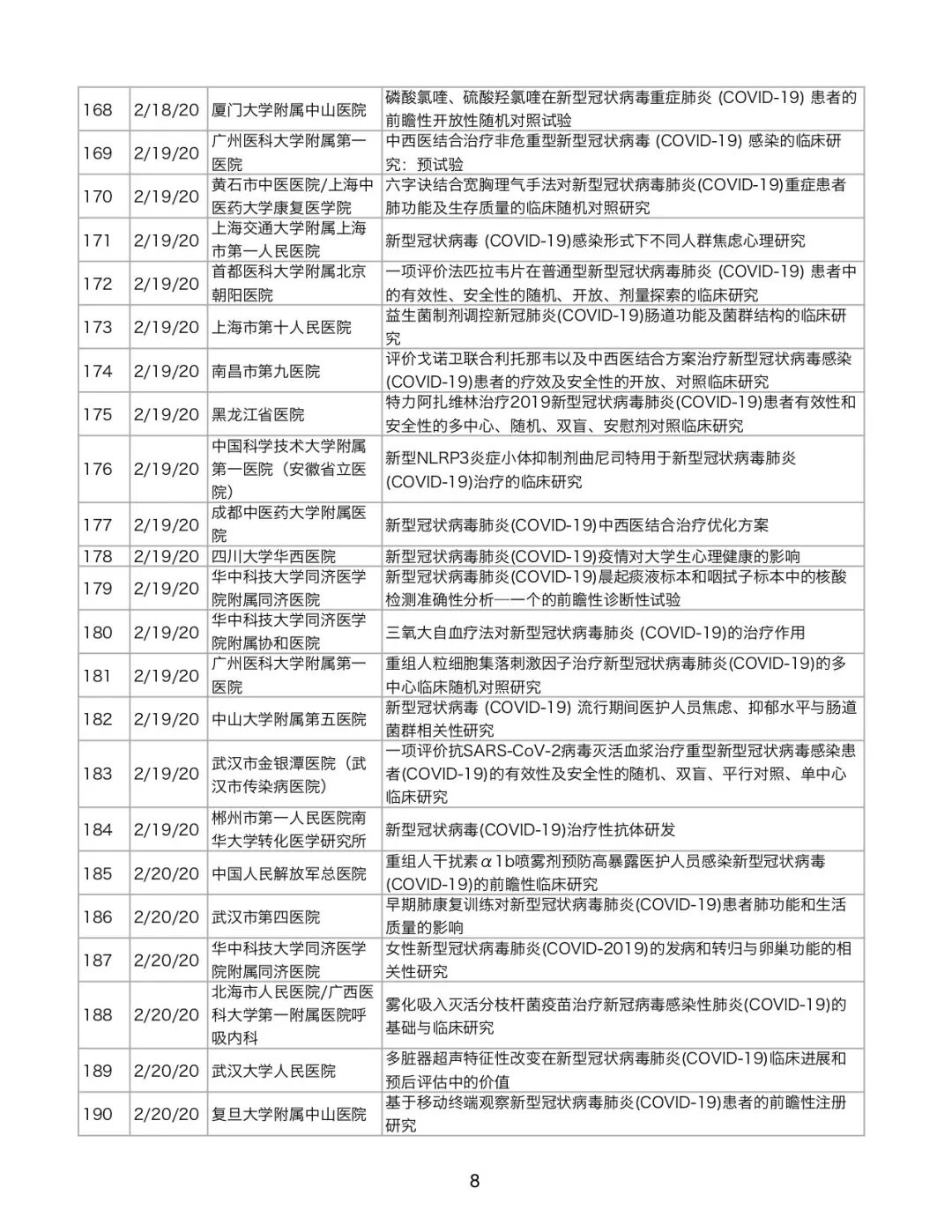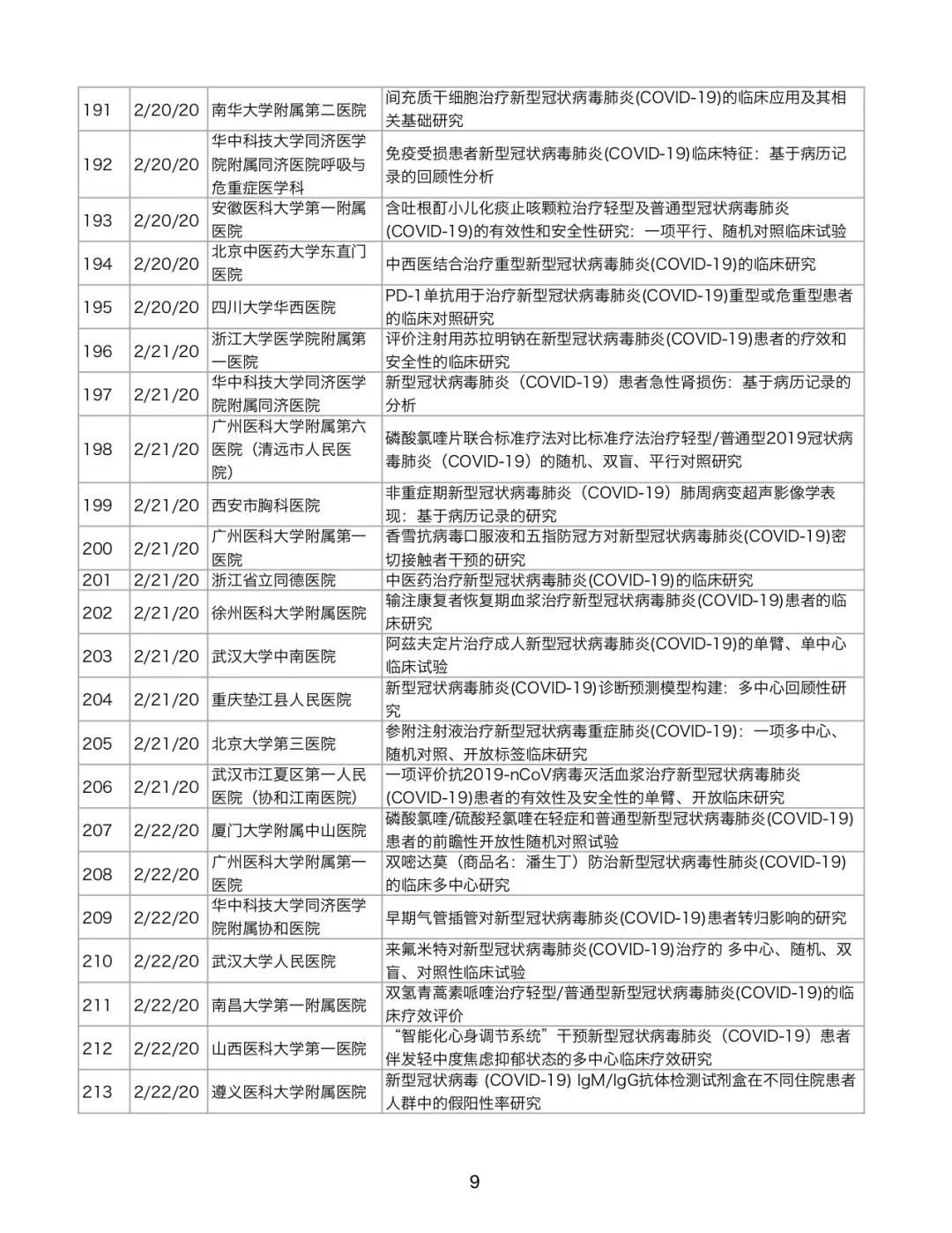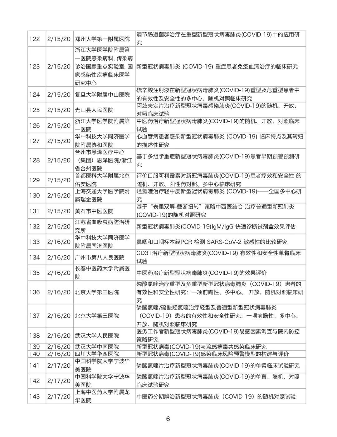 中国临床试验注册中心查询可知,武汉大学人民医院正在进行的项目至少有 9 个。包括连花清瘟胶囊 / 颗粒治疗试验 2 项(针对疑似病例的 1 项和针对确诊病例 的1 项),羟氯喹治疗疗效研究,雾化吸入喜炎平注射液治疗研究,评价羟氯喹对新冠暴露后的密切接触者预防效果的研究,医务工作者新冠肺炎易感因素调查与院内防控策略研究,多脏器超声特征性改变,来氟米特临床试验。最近的一个项目是重组人白介素 2 治疗新型冠状病毒肺炎的临床研究,该项目注册时间是 2 月 24 日。中国临床试验注册中心网站显示,该研究尚未获得伦理委员会批准。
