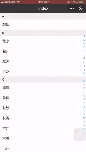 以上便使用iview weapp完成了wx端indexlist组件的开发, 效果如下:
