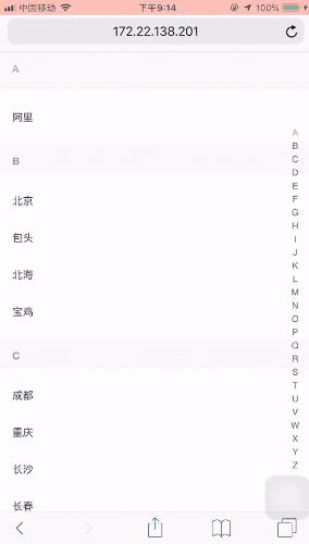 以上便使用cube-ui完成了web端indexlist组件的开发,效果如下: