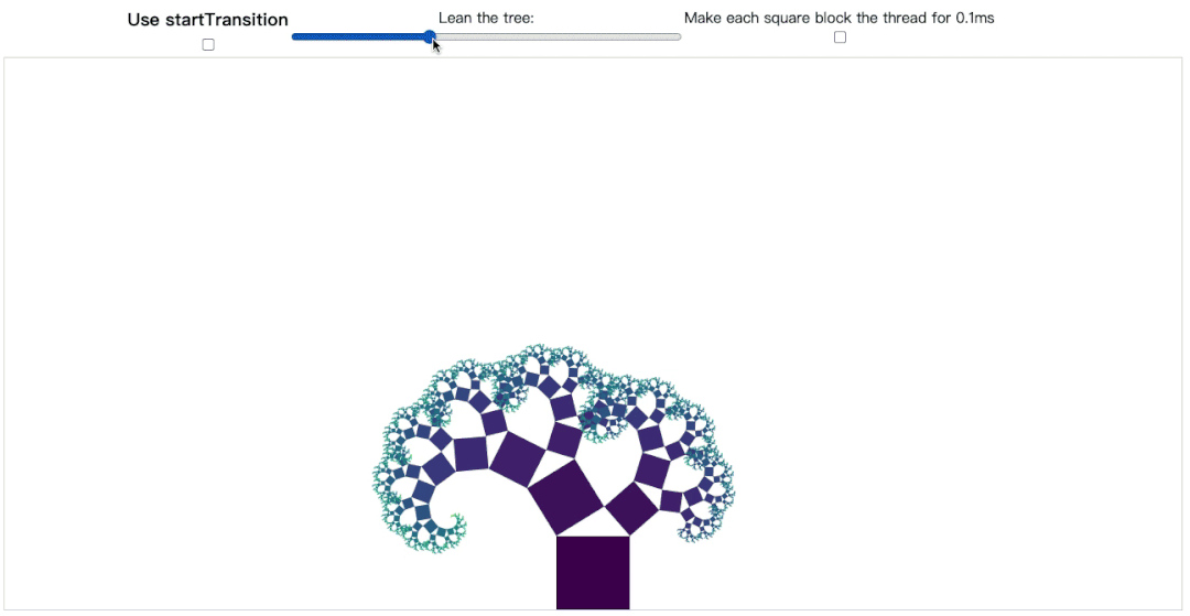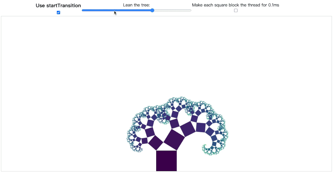 以上代码,我们通过 startTransition 标记了非紧急更新,让树的更新变成低优先级的,可以被随时中止,保证了高优先级的 Slider 的体验。