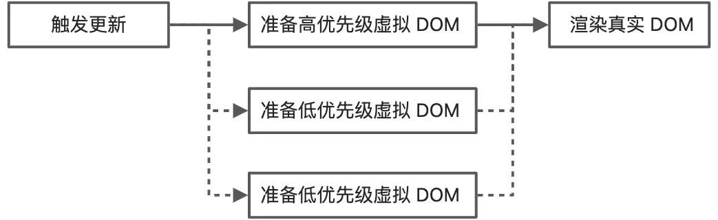 React 会在高优先级更新渲染完成之后,才会启动低优先级更新渲染,并且低优先级渲染随时可被其它高优先级更新中断。