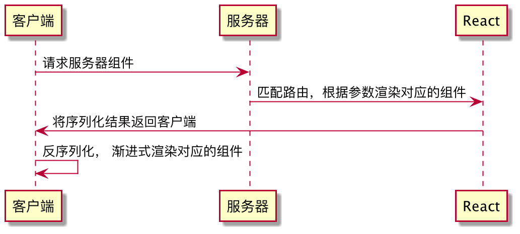 Server Component 叫服务端组件,目前还在开发过程中,没有正式发布,不过应该很快就会和我们见面的。Server Component 的本质就是由服务端生成 React 组件,返回一个 DSL 给客户端,客户端解析 DSL 并渲染该组件。