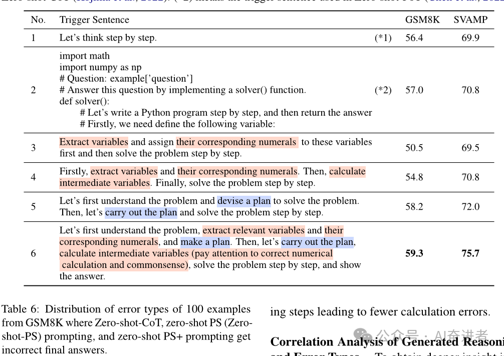 本文的主要贡献是在CoT提示领域引入了一种新的方法,即PS提示,它允许LLMs在没有示范例子的情况下制定详细的计划并执行该计划,从而提高其在复杂推理任务上的性能。这种方法不仅可以帮助LLMs更好地理解问题和解决问题,还可以减少由于计算错误或遗漏关键信息而导致的错误。