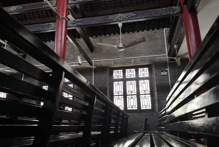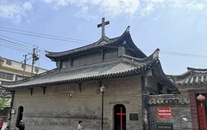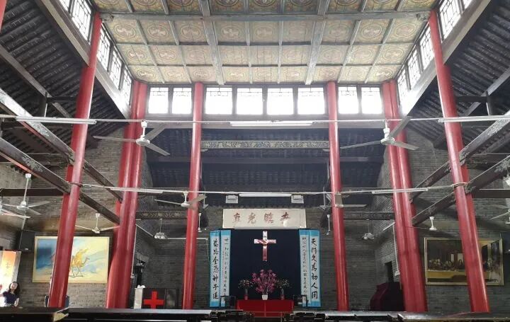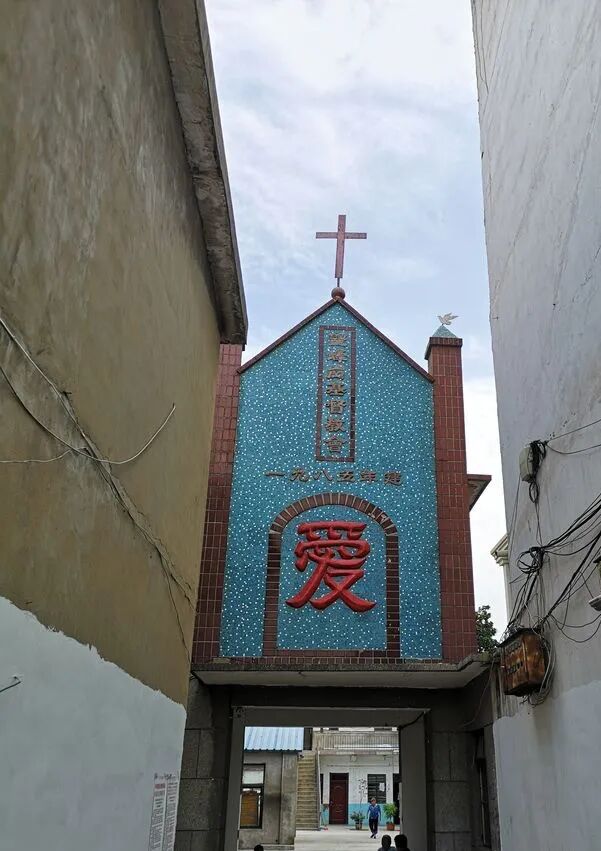 寿县在淮南市的西南部在沿途路过的楼和楼的夹缝里,我猛然看到一个由靛蓝色马赛克瓷砖砌成的狭长门脸,上面鲜红色的 “爱” 字浮雕在灰白色的坏境中格外醒目。虽然大门有点局促,但走进去之后空间十分宽敞。看门的大爷脑部有一道明显的手术疤痕,说话和行动都不太利索,他对我的问题置之不理,只是笑呵呵地将我们领到一栋建筑门口,示意我们上楼,接着径自回到门口的小板凳上坐下。 虽然不明所以,但我们还是顺着楼梯上到二层,面前铺开两排教室,其中一间里,牧师正对着当地居民讲解《圣经》,和前一天一样,我们只是站着,就有人出来搭话 —— 一位四十多岁的大姐从后门出来,说正在讲课的牧师在国内非常有名,学生们都是从外地专程赶来的,大姐本人也是从浙江省过来的。过了一会儿,又出来一位四十岁左右的男性,大姐说这是副会长(忘了是哪里的副会长了),副会长带我们上三层参观了礼拜堂的内部,他告诉我们,基督教在当地有非常久远的历史,信徒中大多数是当地农民,有的字都不认识,就这么一代传一代的信过来,随着外出上学、务工人数的增加,男性和青壮年数量锐减,上了年纪的妇女成了信众主力军。谢过副会长,我们再次驱车前往本来的目的地 —— 位于寿县的一幢有着近百年历史的教堂。这座教堂建于 1921 年(也有说是 1922 年),屋檐为重檐庑殿顶,是经过民间匠人改造的中式传统管制建筑,但在屋顶的正脊线上,竟竖着一生锈的十字架。进入内部,教堂虽然经历过大修,但木质的天花板结构保存得很好,梁枋下木条纵横排布,组成井字形框架,框架内钉板,再饰以彩绘,是清代流行的正方形方格平綦,仍是中式。很难想象,这栋古色古香的建筑自建成之初就是教堂,后还作为当地第一次代表大会的会场使用过,时至今日,已经是重要的文物保护单位。