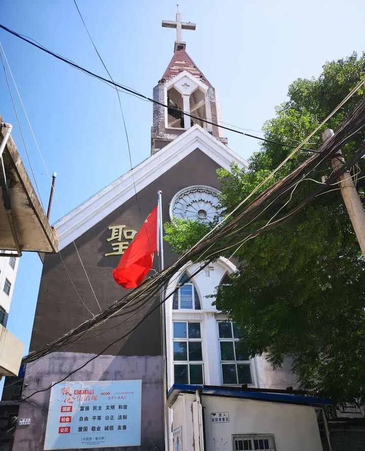 谁说教堂的窗户只能是彩绘玻璃的这仅是当地第二古老的教堂,最古老的那座已经完全被破坏,没有留下任何遗迹,也就是说,当地的基督教信仰可以追溯到比 1921 年更久远的年份。听这里人讲,寿县是国内基督教的根据地之一,整个淮南市,乃至周边城市的基督教,都是从这座教堂开始辐射传播的。基督教已经完全融入了当地生活,人们对其习以为常,这一点在拉我们的出租车司机那里也得到了印证,他不信教,却对基督教有着十分正面的评价:“我们都觉得很平常啊,我虽然不信,不过我的家人有信的,我知道这是一个劝人向善,教导人们多做善事的教,信了也不是坏事,这就可以了。我现在开着车也没有时间去教堂什么的,过几年不干了,有时间可能也会去看看。”来此参观的游客并不多,每天络绎不绝的是过来礼拜的基督徒,夏天的礼拜日是高峰期,从每天早上七点半开始,会有上百信众坐满楼上楼下。 到底为什么,基督教义能在遥远的东方县城、农村居民中迅速深入人心,并跟他们本来的价值观毫无冲突地融为一体?在教堂外,我们看到一块标题为 “用圣经真理注释社会(主)义核心价值观” 的板子,随即有点明白了:不是中国县城去适应基督教,而是基督教适应了中国县城。