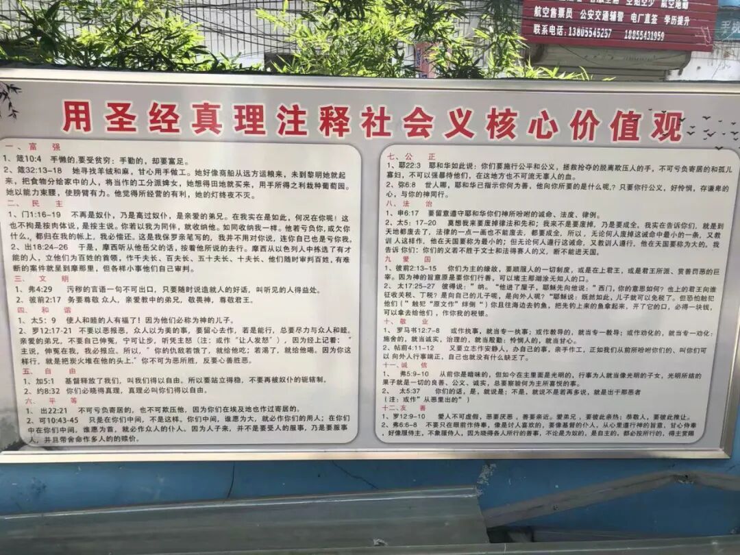 人们找到了圣经中所有跟 “富强、民主、文明……” 有关的句子,排列在板子上,既然圣经可以解释一切,当然也能解释社会主义核心价值观。
