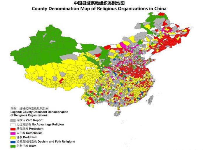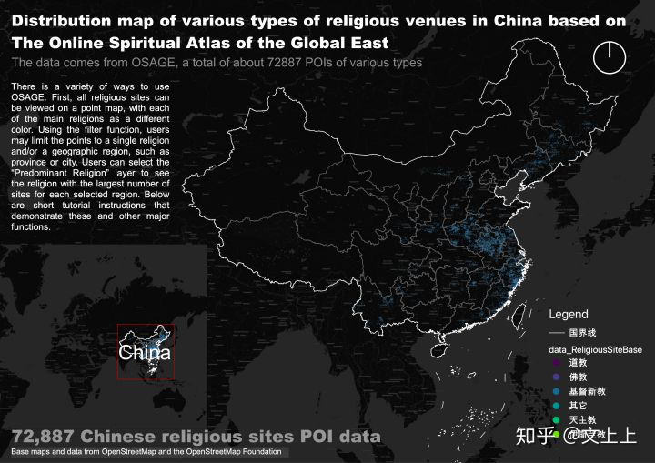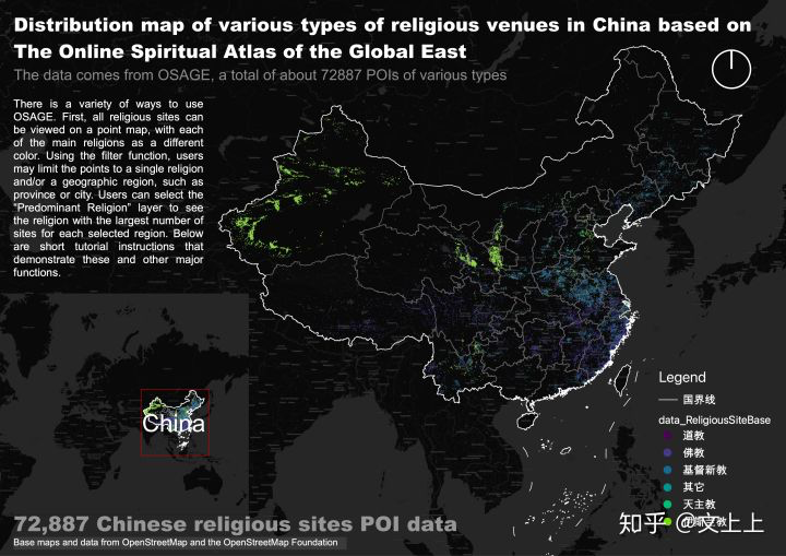 在佛教掌握着民间歌谣《莫生气》的 IP 时,基督教也在文化输出方面迎头赶上,普渡大学宗教与中国社会中心研究中心的数据显示:基督教已然在我国东北地区和中原地区取代了传统宗教。知乎网友 @文上上 将普渡大学提供的宗教位置点数据使用 QGIS 可视化后,结果更为一目了然: