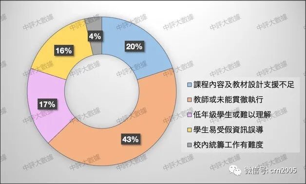 进一步深入分析发现(如图5),港人的疑虑主要集中在与教师个人素质相关的问题上,占比为43%,认为香港不少教师连基本的国家观、国民认同都存在偏差,更遑论他们引导学生产生正确的国家安全认知与价值观。有不少观点担心,即使教育局的国安教育课程指引多么清晰明确,但有些教师仍会从中找到漏洞,向学生潜移默化地渗透自身的政治立场,令国安教育的良好初衷遭到扭曲。