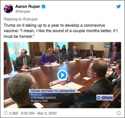 次日,天津大学生命科学学院黄金海教授团队宣布,已成功研发出新型冠状病毒口服疫苗,目前正寻求合作方,推动疫苗早日走向临床。该疫苗以食品级安全酿酒酵母为载体,以新型冠状病毒 S 蛋白为靶点产生抗体。据悉,疫苗研发团队「黄金海教授本人已经 4 倍量口服新冠疫苗样品,无任何副反应」。2 月 26 日,俄罗斯副总理称俄罗斯已经研制出 5 种新冠病毒原型疫苗;2 月 27 日,流行病应对创新联盟(CEPI)宣布,除 Moderna 外,将资助另两家机构 Inovio 和澳大利亚昆士兰大学研发新冠疫苗;2 月 28 日,以色列的一家研发机构声称他们将在 3 周之内完成疫苗的主要研发工作,疫苗预计最快在 90 天以后能够问世;3 月 2 日,美国总统特朗普在与制药公司高管和公共卫生官员的会议上,要求在「几个月」时间内开发出新冠疫苗;![]()