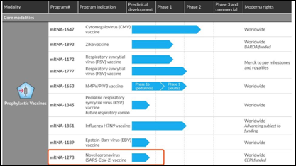 从疫情爆发到现在仅 3 月余,即使有疫苗研发成功,也还只是在实验室阶段,最终问世并真正应用于疫情防控,仍需要等到数月乃至数年以后。美国加州大学洛杉矶分校公共卫生学院副院长张作风教授告诉丁香园,「从理论上来讲,新冠病毒疫苗应该至少还要等几个月的时间。有些硏究单位大概从 4 月开始进行动物实验,之后还要进行人体试验,最快可能要等到 9 月份。」目前正在开展和即将开展的疫苗研发,主要是集中在重组蛋白疫苗、重组腺病毒载体疫苗、mRNA 疫苗和灭活疫苗这几类。其中,mRNA 疫苗算是一个比较新颖的疫苗生产方案。与传统疫苗生产需要灭活病毒或重组抗原蛋白不同,由于 RNA 在生物体内可以负责蛋白质的合成,研究人员只要知道病毒 RNA 序列,就可以直接对 RNA 进行修饰和编辑,跳过合成重组蛋白或病毒的步骤,直接将 RNA 注射到体内,让体细胞自身产生蛋白抗原。Moderna 瞄准的是冠状病毒上的 S 蛋白(spike proteins),该蛋白可以与细胞表面 ACE2 受体结合并感染细胞。Moderna 的研发策略是将 S 蛋白的 mRNA 指令包装成脂质纳米颗粒,通过将纳米颗粒注射到人的肌肉中,让人体细胞产生病毒蛋白。理论上来说,这种方法可以让人体产生抵抗力。进入人体的 mRNA 能够进一步指导抗原蛋白的翻译,指导完成后在体内降解。但理论毕竟是理论,mRNA 疫苗技术早在上世纪 90 年代就已经出现,之所以一直未取代传统疫苗工艺,是因为它非常受制于技术、mRNA 本身性质等诸多因素。普通疫苗(灭活病毒或抗原蛋白等)一般比较稳定,可以通过静脉注射的方式到达体内,但 mRNA 本身非常不稳定,容易降解。为了解决这一问题,目前常用的手段就是 Moderna 这种利用脂质体包埋等技术将 mRNA 制成纳米颗粒,通过肌肉注射等技术进入人体的方式。但这些纳米颗粒以及其中的 mRNA 进入人体后到底会不会按照人们预想的那样行使功能,还不得而知。因此,虽然在疫苗的研究和设计阶段 mRNA 疫苗能够缩短不少时间,但实际效果依然不得而知。Moderna 曾于 2019 年 8 月成功开发寨卡病毒疫苗,产品代号为 mRNA-1893,但至今仍未上市。此外,目前为止,全球还没有一款 mRNA 疫苗上市。Moderna 公司生产管线显示其 RNA 疫苗所处研发阶段(Moderna 公司官网)