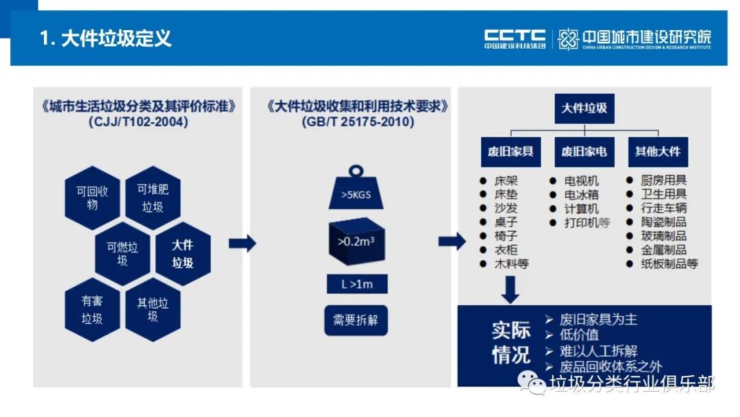 大件垃圾是指体积较大、整体性强,需要拆分再处理的废弃物品。包括废家用电器和家具等。它是垃圾分类与再生资源体系的重要交点兼具环卫、再生资源双体系的痛点和难点。