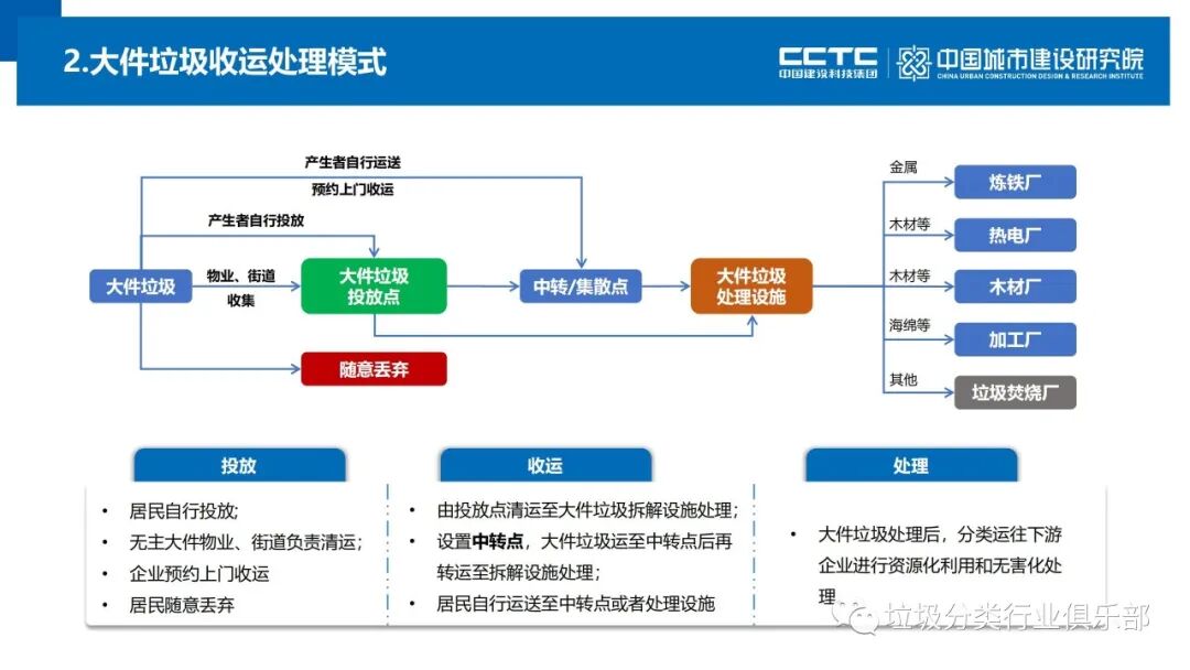 大件垃圾收运处理主要问题是:1、居民乱投多,付费意愿低;2、收运设施选址难;3、体积大、密度小,收运成本高;4、末端产品销路少,收益低。