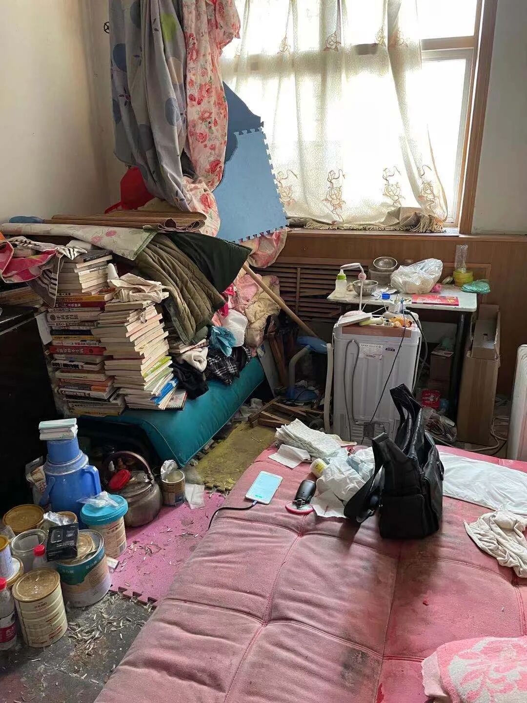 在郑利平位于桥西区的家里,尽管自女儿坠楼后,不断有社区工作人员和媒体记者到访,但屋内的环境依然脏乱。在房间的一角,几桶奶粉敞着盖子,四周散落着瓜子皮和灰尘。桌上放着一袋几天前买的馒头,旁边的碗和奶瓶还没清洗。郑利平指着一张布满污垢的粉色床垫说,这是平时他和女儿睡觉的地方,妻子睡在另一间房的大床上。