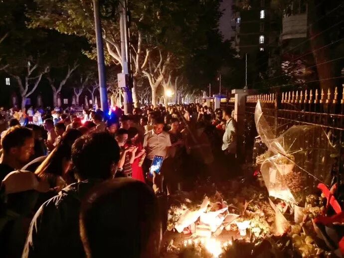 晚上大约9点前后,案发地仍然没有变得和往常一样清冷。那棵梧桐树底下,市民们围绕着由烛光、鲜花、玩具堆成的小祭奠场所进行哀悼,有的人低头凝视,有的人双眼微闭,有的人默默叹气。