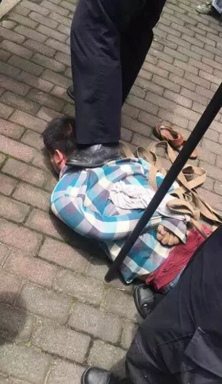 网络上传播的现场视频显示,砍杀男童的男子身着蓝色格子衬衫,中等身材,他在作案后不久即被众人擒拿,匍匐于地。一位空调修理员继而用绳子将其捆绑住。