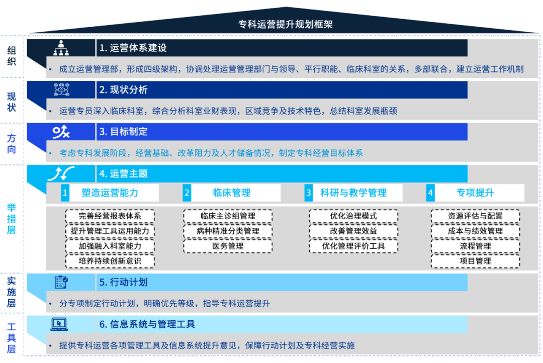 六个层面中,组织架构最为关键,是建立高效的运营管理体系和完善的工作机制的前提;科学合理的分类管理策略,是实现专科运营提升的核心内容,也是后续目标、关键举措制定和实施的基础;从制度、流程和专业技术环节赋能运营管理体系,保证措施落地不走样,是专科提升取得效果的重要保障。