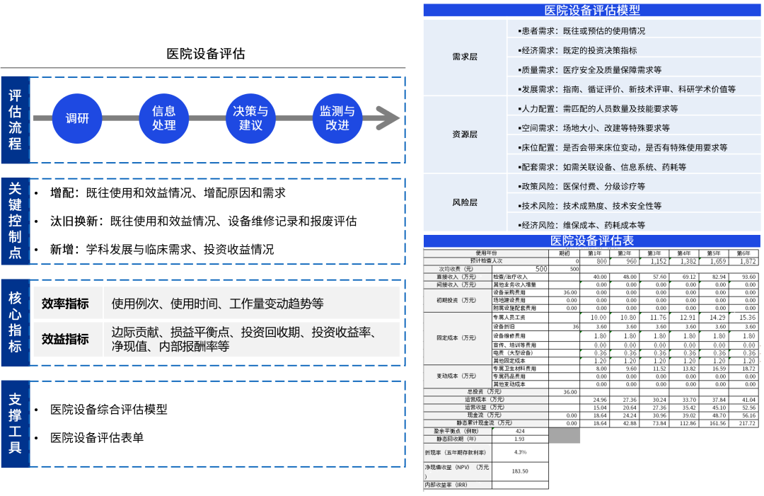 然后,使用医院设备评估模型,就本设备购置的需求、资源及风险进行评估。在需求分析时,需进行临床调研、医学工程调研及采购调研,收集该设备在本院或市场上的安全性、业务量、患者偏好、技术指标等相关信息,使用投资效益分析工具分析设备投入产出情况;在资源分析时需重点关注设备投入是否会造成人员培训、新人员引入、场地改造、信息系统升级、床位变动等,并将相关资源变动纳入投资效益分析考量;在风险分析时主要关注政策风险,如是否符合分级诊疗趋势,是否纳入医保报销范围,技术成熟度和安全性等技术风险,药耗成本及维保成本等经济风险。