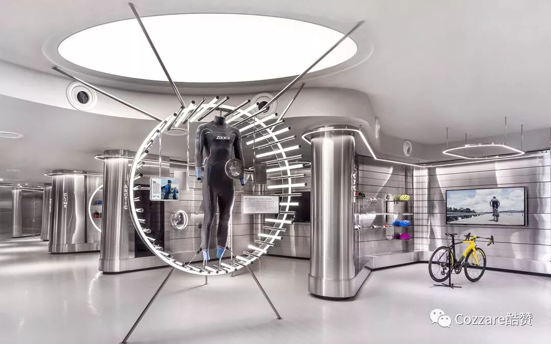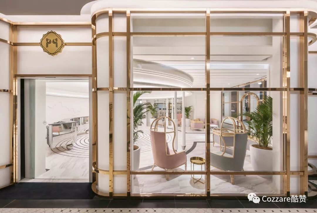 设计师巧妙地考虑到酒店用地狭长的特点并将之转化为酒店的优势。通过金色不锈钢饰面形成纵横向的檩条和横跨,承载着玻璃对室内解构出新的空间,创新性地采用了店中店的概念,来打破线形的平面,并在首层创造出了令人愉悦的零售商铺界面。