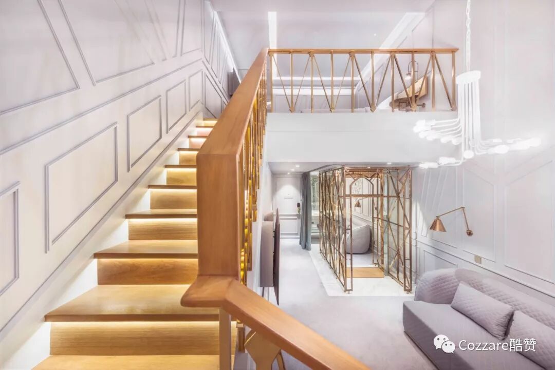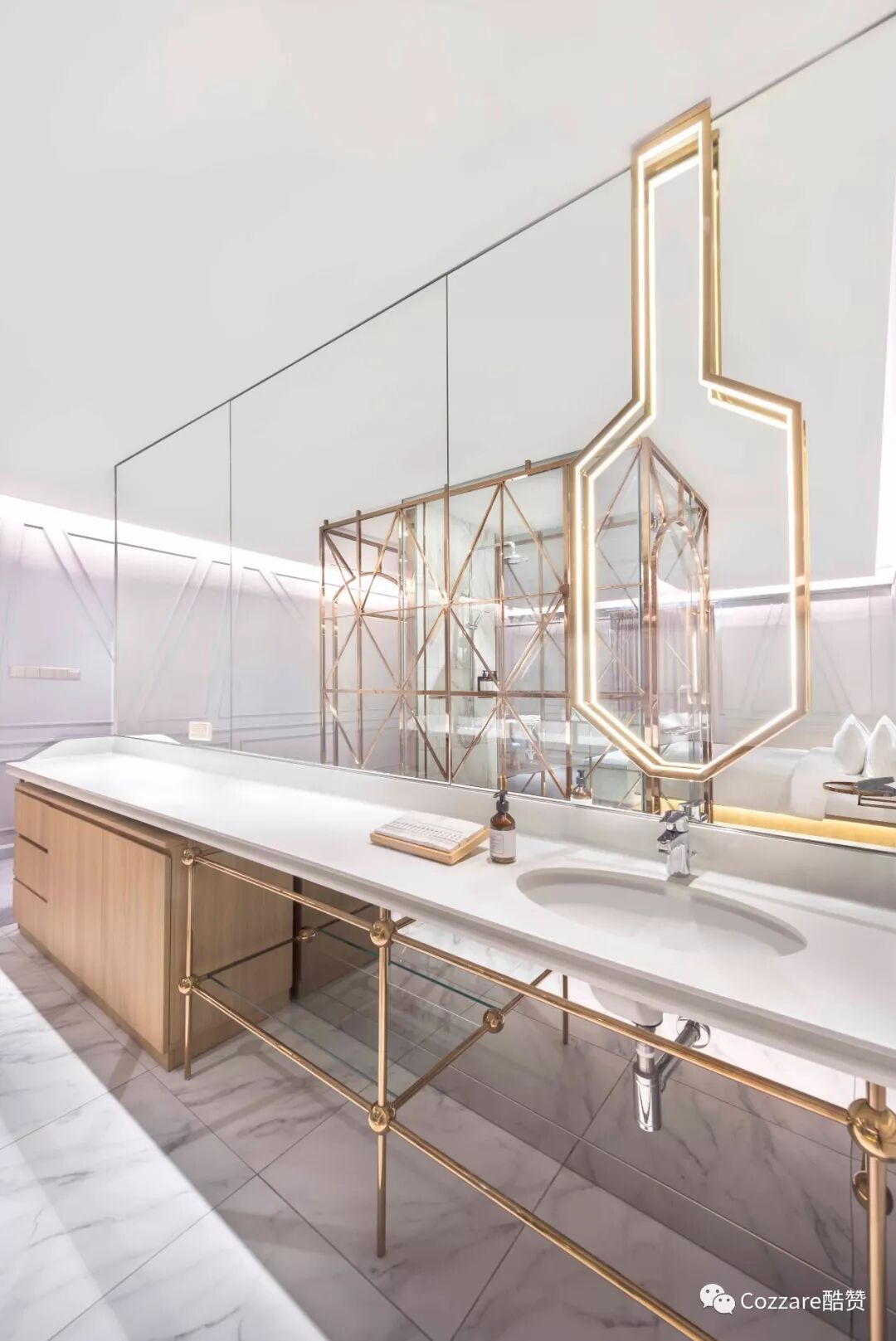 弧形在客房的运用如同大堂区一般,在交错几何元素中很好的融合并不突兀。金色不锈钢被运用在客房各处,如精致的电视背景柜、衣柜、浴室等区域,装饰灯具、家具、楼梯栏杆也采用这种材质。