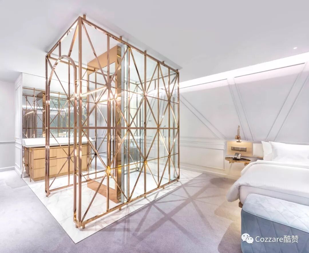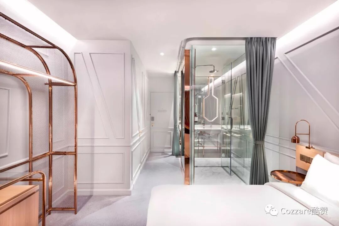 室内客房与走廊墙面一致,采用了石膏线脚却运用几何的方式表现,流连于古典与超现实之间,又与其它装饰中的交错元素呼应。