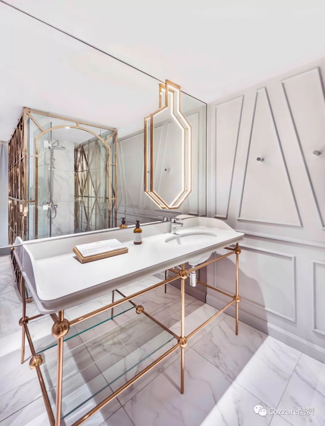 卫生间选用表达热带植物的墙纸,设计师不会放过镜面在这里的运用。客房视觉通透却功能各自独立,在间接照明的烘托下,整个客房犹如珠宝般的晶莹剔透。