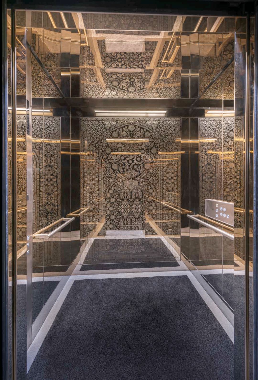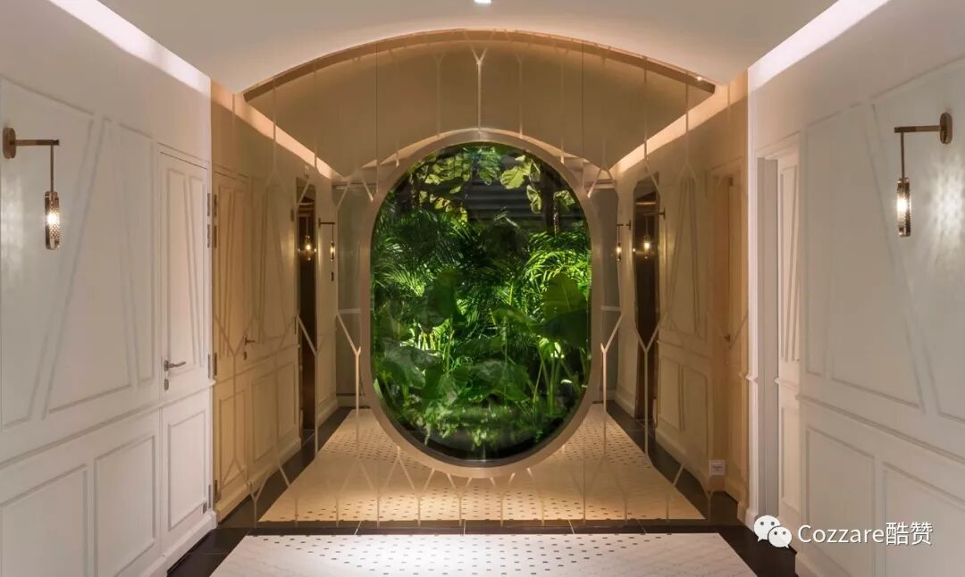 客房走廊运用了大堂的元素,在电梯以及走道尽端处均采用了金色不锈钢装饰,尽端处的茶镜延长了视觉效果,镜内垂直绿化出人意料地表达,通过隐藏式灯带配以局部壁灯的照明方式,奇妙地搭配产生处一种奇迹般的错觉冲击。电梯轿厢运用双重镜面,将传统图案纹样在此处无限重叠。