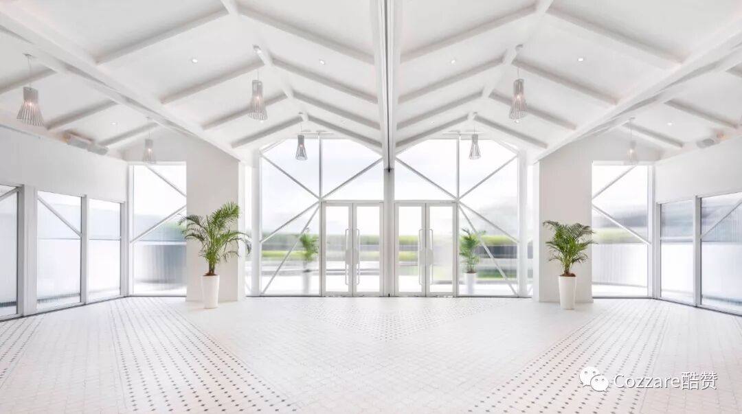 多功能厅以及室外空间的亭子被解构成纯粹的几何图案,这一切源于桁架的构造,同时也呼应了大堂区室内墙面的交错金属网。