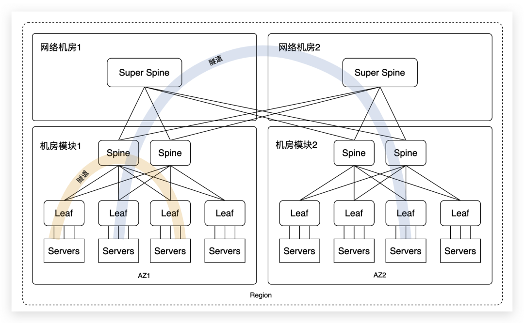 一个Region需要一套网络资源池,提供该Region内共用(多AZ、多VPC共用)的底层数据包转发,该资源池是由跨机房模块(也即跨AZ)的多组Leaf+Spine模块组成,跨机房模块的网络交换通过一组Core节点(Super Spine)交换机实现。