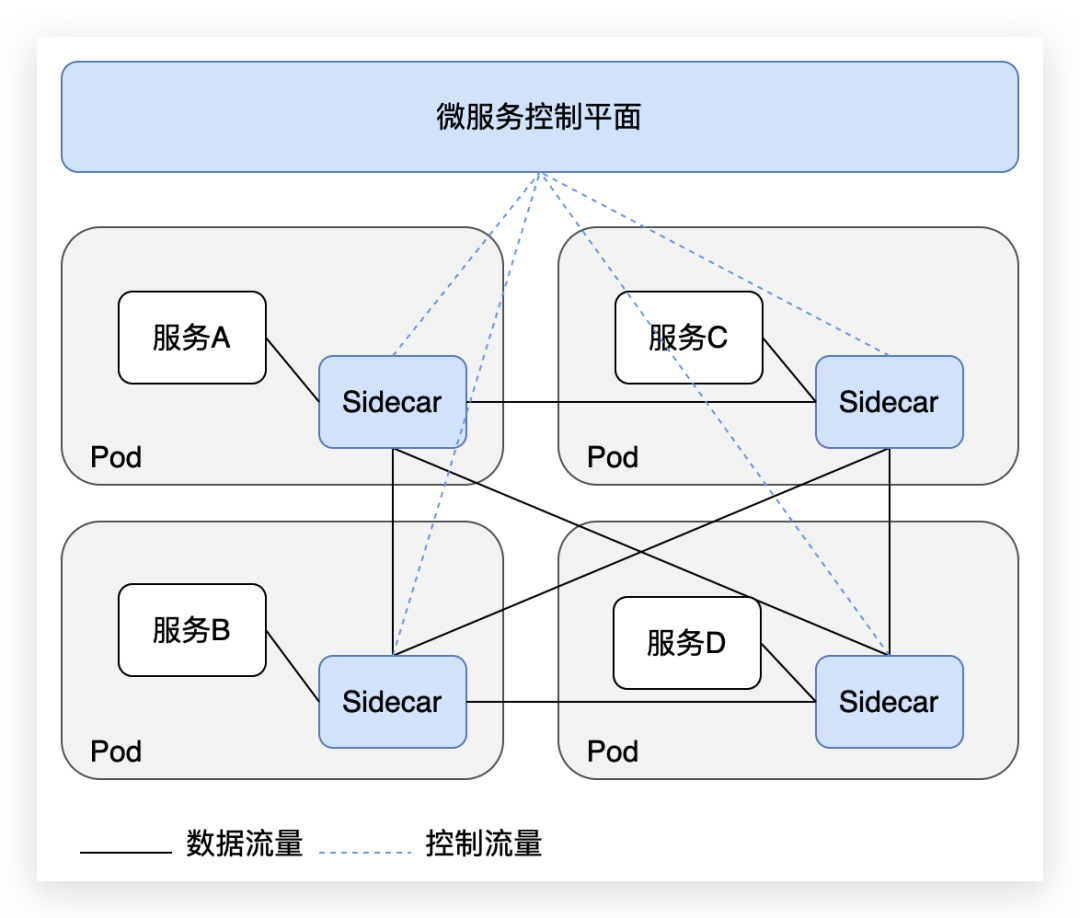 比如:Istio服务网格在服务的每个应用容器旁运行Envoy代理作为sidecar,所有sidecar都受微服务控制平面管理。