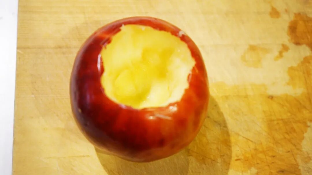 这道食谱的准备工序如下:将苹果切成两半,但不要切得太深,以免穿透底部。然后挖掉苹果的中心,加入以1:9比例混合的肉桂粉和砂糖,将肉桂糖填满苹果洞,最后在顶端放上黄油。