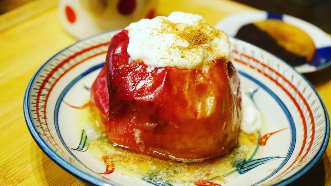 我是一个没有任何烤苹果回忆的异乡人,只不过是猎奇地寻找着一些秋冬的温暖元素。但我的烤苹果成品在社交网络上得到了日本同龄友人的纷纷点赞,他们告诉我那是他们小时候的味道。友人们各自拥有独家的享用烤苹果的方法,有一位建议我浇上酸奶后使用,还有一位建议我在苹果里倒进葡萄酒。我把这两种方法混合在一起试了试,只觉得实在美味。