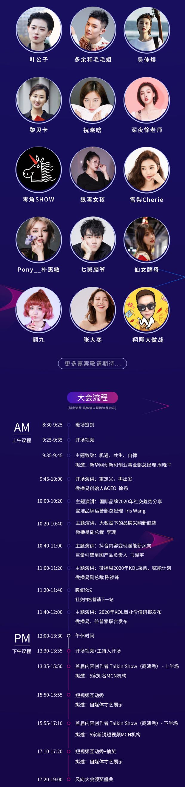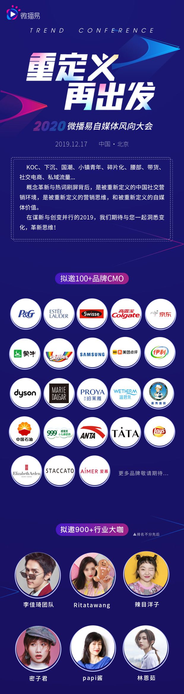 双十二社交营销,只是现今社交营销市场的冰山一角,在消费结构快速变革2019,社媒市场、KOL价值、社交营销思维都在悄然变革,面对快速更迭的社媒环境,微播易、MCN机构、KOL、品牌、行业大咖还有很多话想说,2020微播易自媒体风向大会,我们一起洞悉变化,掌握真相,打破瓶颈,破局增长,12.17我们在北京等你。