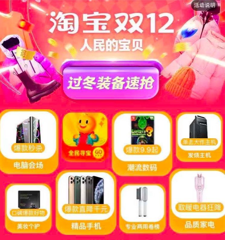 从电商平台对社交营销的运用上看,京东双十二“好物开杠”主题活动于12月1日开启,以直播为主要形式,于京东、抖音双平台分享智能好物,现场评测多款爆款网红产品;淘宝则从12月1日开启双12预热,以直播等形式开展全品类直降、海量大额券,以及熟悉的超级红包等优惠支持。同时,建立小程序等组件,通过小游戏、红包雨等多形式在平台内部给予支持。